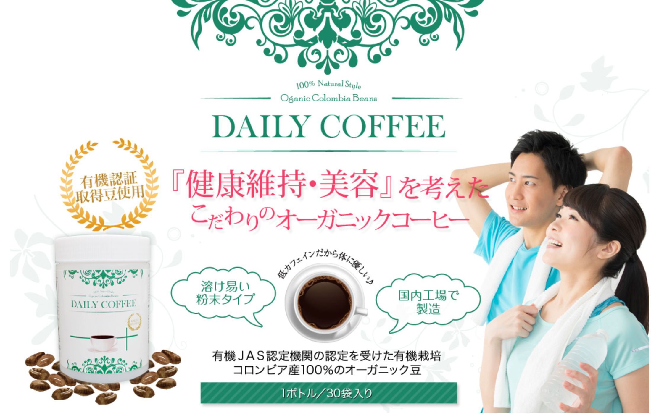 デイリーコーヒーは、健康維持・美容を考え、天然食物繊維、乳酸菌、オリゴ糖や ミネラルなどをバランスよく配合したたこだわりのオーガニックコーヒーです。